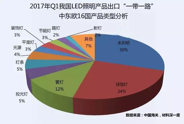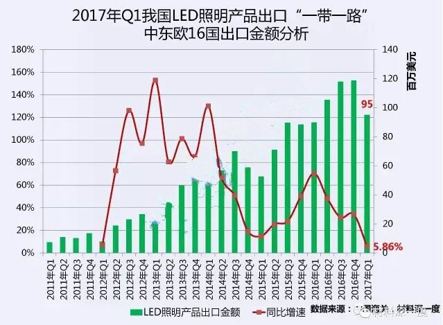 据统计,2017年一季度我国LED照明产品出口中东欧16个国家的总金额达9508万美元,同比增加5.86%