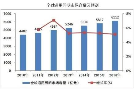 据麦肯锡咨询公司发布的全球照明分析报告,目前全球通用照明占照明器具制造市场大约 75%的份额。2010 年全球通用照明市场容量折算约为 4,402 亿元人民币,2011 达到 4,655 亿元人民币,增幅 5.8%。未来的几年中,随着全球人口的增加、发展中国家城市化进程的加快以及人均可支配收入的持续增长,通用照明市场将保持持续稳定增长,到 2016 年达到6,112 亿元人民币。而中国作为照明产品的生产和消费大国,在全球照明市场拥有不可替代的地位。