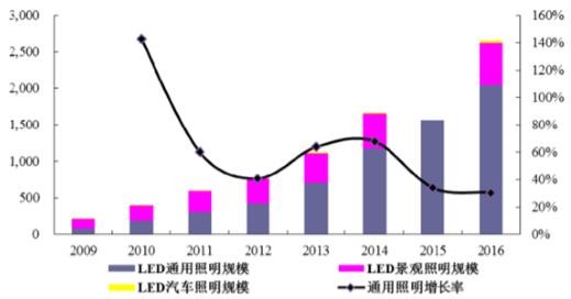 LED照明产品日益普及,今后也将有数百亿的市场持续得到释放。根据中国产业发展研究院数据显示,2014-2016年,我国LED照明应用行业规模由1,683亿元增长至2,678亿元,年均复合增长率为26.17%。其中,LED通用照明规模由2014年的1,169亿元增长至2016年的2,040亿元,年均复合增长率为32.08%;2016年LED通用照明规模占比达到47.60%,是市场发展的主要推动力。