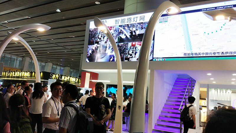 在展馆内,小编见到了不少企业摆出了智慧路灯,抬头一看,路灯杆集成了LED灯具、Wifi热点、摄像头、一键报警、LED公告屏、充电桩等硬件设备,并使灯具摇身一变成了智慧城市建设中一体化的感知载体。
