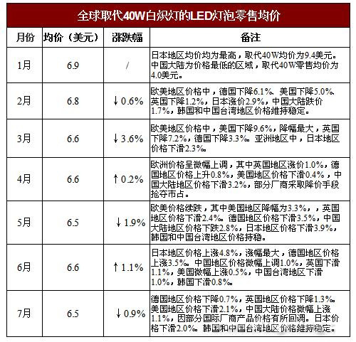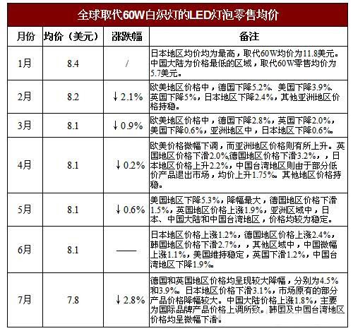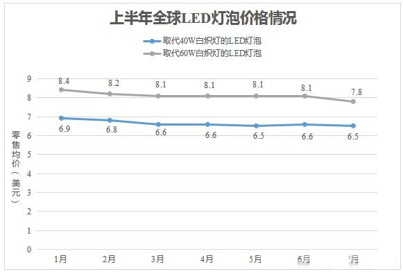 虽然去年迎来罕见的逐轮价格上涨潮,上游材料、芯片、封装、物流、人工等方面不同程度地上调价格,但今年以来,普通LED灯泡的价格依然总体呈下降趋势,国外大厂以低价促销、低价新品抢市,其中LED灯丝灯在欧美的盛行,也使LED灯泡价格竞争压力增大,价格被迫下跌。日本地区均价维持在较高水平,中国经过前两年的恶战,价格下滑趋势也趋缓,均价较为平稳。