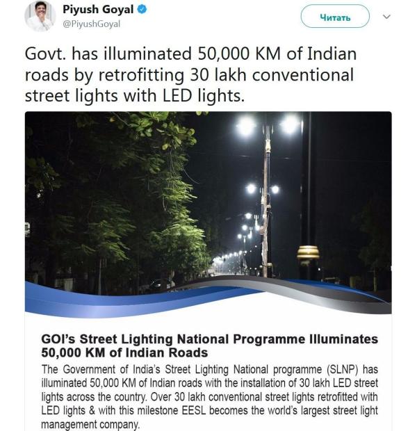 此后他删除了这条推特博文,并贴出了另一张印度道路的照片。在这则推特博文中,这位部长描写了政府在街道照明项目上取得的成就,在这一项目的框架内对约5万千米道路进行了发光二极管照明系统的安装和建设。