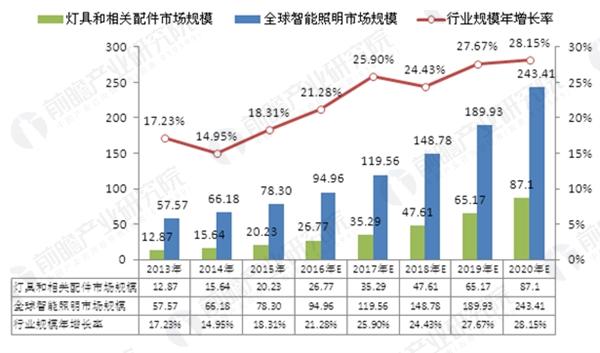 数据显示,2013年时全球智能照明市场行业规模约57.57亿美元,其中灯具和相关配件市场规模约为12.87亿美元;2015年全球智能照明市场规模达到78.3亿美元,增长十分迅猛。按照当前发展势头,预计2020年可达243.41亿美元,其中灯具和相关配件市场规模约为87.1亿美元,占比超过5%,年复合增长率超过20%。