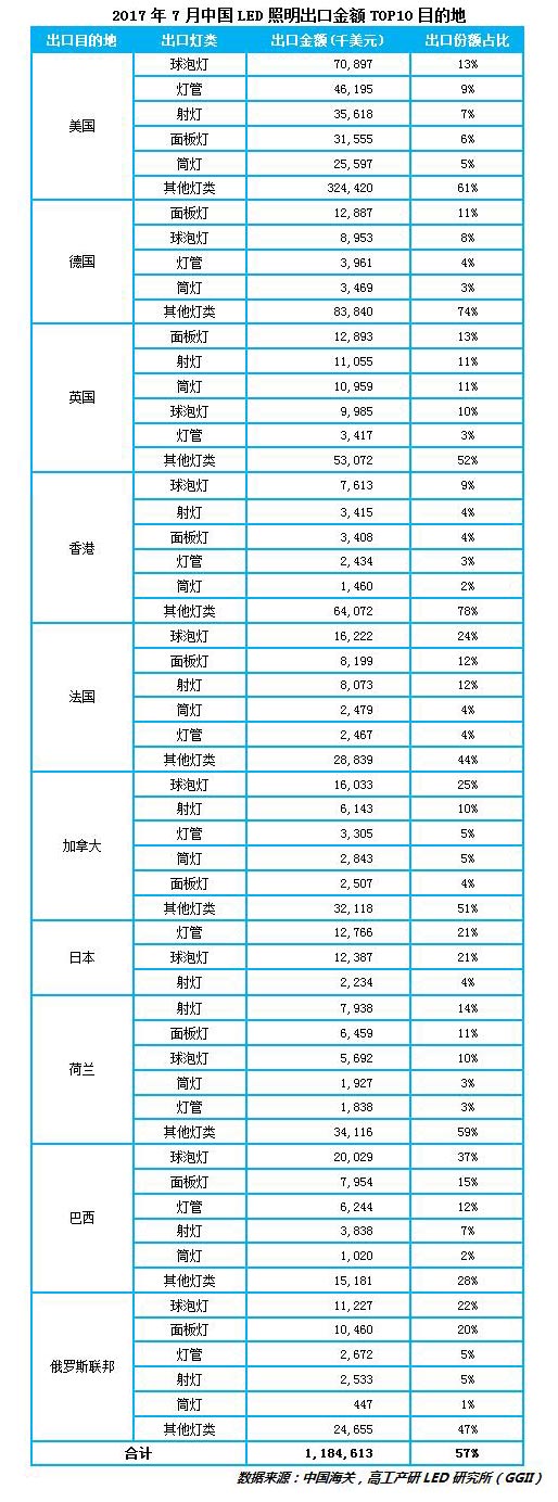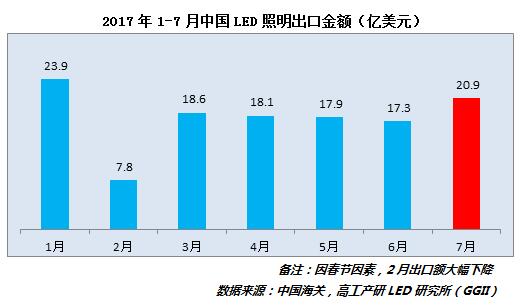 GGII发布的《2016-2017年中国LED照明出口月度监测报告》数据显示,2017年7月中国LED照明出口总额达20.9亿美元,较上月增长21%。总体来看,自前面3-6月份出口市场行情下倾以来算是一大增长的整体态势。