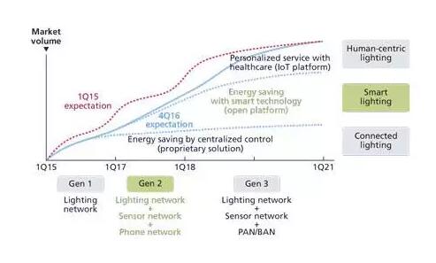 数字照明的未来正在三个阶段的转型中成形(图1)。转变的形式为网络照明、智能照明或HCL(也称为健康照明)。截至2015年,这些转型的领域似乎非常明显,但现在有很大的重叠。