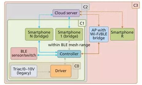 智能手机控制通常可以分为三个层次:C1,C2和C3,在大多数情况下,C0是目前在用的传统控制方案(图2)。可以选择现有的驱动程序添加一个专用控制器,在C0顶部装上BLE传感器或开关,这样可以直接控制,无需云服务器。在C1模式下,多个智能手机控制可以让用户与其他人一起分享照明控制。