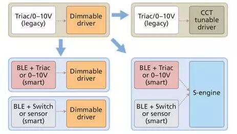类似地,相同的技术可以应用于开关和传感器上,将大多数现有组件转换为智能组件,同时保留其原有设计中的一些组件。使用向后兼容的智能驱动程序,现有的控制器可以匹配新的CCT可调驱动程序。此外,LED模块、驱动器和控制器可以合并成单板(或称为S引擎),以将成本降低到可接受的水平。
