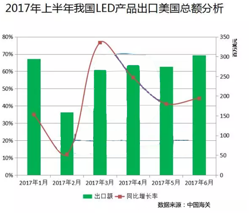 从图中可以看出,2017年上半年我国对美国出口的LED产品与去年同期相比总体呈现向上增长的态势。上半年,我国LED照明产品的出口的同比增长18.14%,增长较为缓慢,而美国市场的同比增速明显较高。