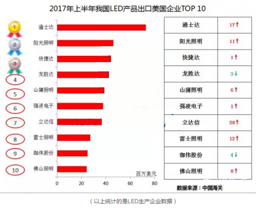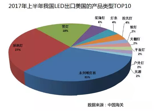 2017年上半年,我国LED照明产品出口美国接近16亿美元,同比增长44.24%,在我国LED出口目的国中稳居宝座,占我国出口总额的比例为26.66%。