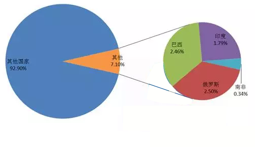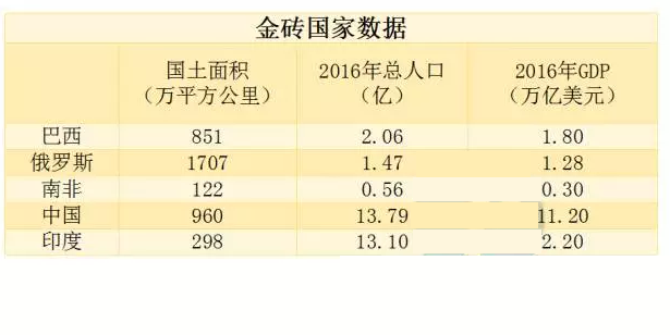 金砖国家由中国、巴西、俄罗斯、印度和巴西5国组成,分布在亚洲、非洲、欧洲和美洲,是当前全球主要的新兴经济体。5国国土面积占世界领土面积的26.46%,人口数量占世界人口数量的42.58%,2016年GDP总量占全球的22.29%左右。