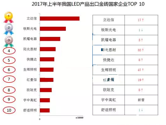 上半年,我国LED产品出口企业达11323家,其中出口金砖国家的企业有2284家,约为总数的两成。其中前30家企业的出口总额占整体出口金砖国家总额的41.31%,前十企业出口额占整体比例约为23.00%。
