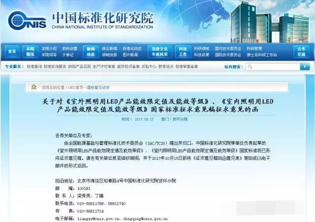 9月27日,中国标准化研究院在其网站上发布《关于对《室外照明用LED产品能效限定值及能效等级》、《室内照明用LED产品能效限定值及能效等级》国家标准征求意见稿征求意见的函》,请各有关单位抓紧组织审阅,并于2017年10月15日前将《征求意见稿回函意见表》寄回或以电子邮件的形式返回。