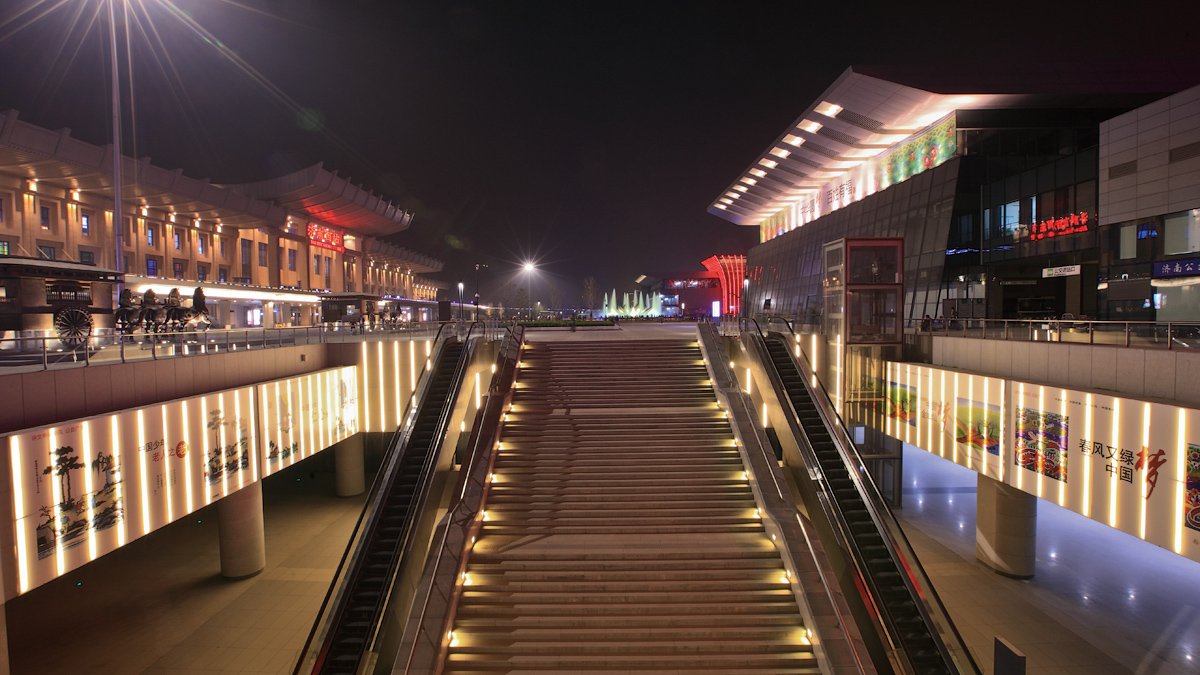 伴随着济南西站东广场——“礼乐广场”。据了解,“礼乐广场”面积约7公顷,为高铁东站房、南北综合体建筑和站东路的围合区域。“T”形广场中轴体现“礼”和“乐”主题,以古代青铜器“樽”与古代乐器“琴”为原型设计的综合体建设已经基本完工。广场中心宛如“和氏璧”的荷花喷泉水池的喷水设备已经交付使用。