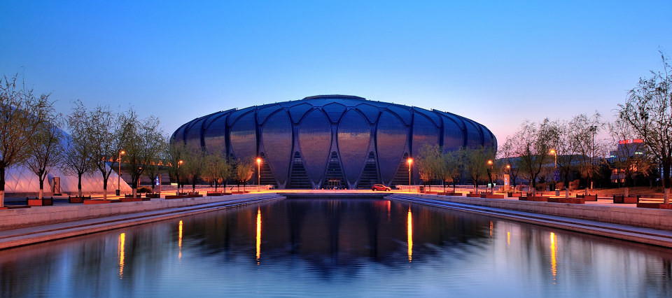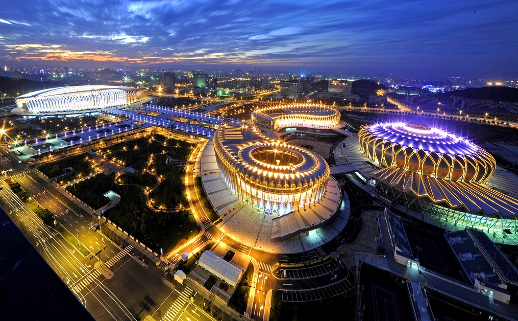 济南奥体中心体育场,位于济南东部新城区,作为全国第十一届运动会主会场的济南奥体中心主体,包括体育场、体育馆、游泳馆、网球馆等"一场三馆"。外形设计以济南"市树"柳树为母体,将柳叶的柔美飘逸凝固成建筑语汇;东区的体育馆、游泳馆、网球馆,以济南的"市花"荷花为母体,由下向上形成花瓣状层叠的机理,隐喻荷花自下向上的生长趋势,形成了"东荷西柳"的建筑景观,突出了泉城济南的文化气息和地域特征。2009年10月16日,第十一届全国运动会开幕式在济南奥体中心体育场隆重开幕。