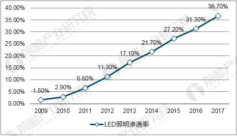近年来,全球LED市场高速增长,已逐步取代白炽灯、荧光灯等其他照明光源,渗透率持续快速提升,灯港照明据新发布的《LED照明产业市场前瞻与投资战略规划分析报告》数据显示,2017年全球LED渗透率达到36.7%,较2016年上升5.40%。