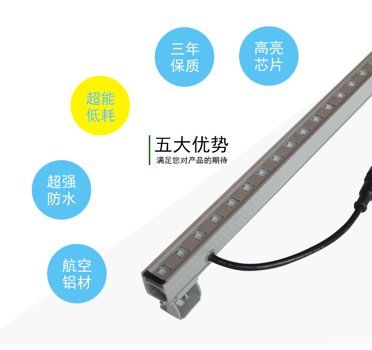 3、LED大功率洗墙灯光源采用进口超高亮大功率LED灯珠,内置恒流驱动电源,确保灯具性能稳定。